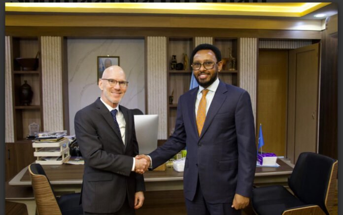 Mogadishu – Somalia’s Minister of Finance, Hon. Bihi Iman Egeh, held a high-level meeting today at the Ministry’s headquarters in Mogadishu with James Swan, the Special Representative of the United Nations Secretary-General (SRSG) for Somalia, along with senior officials from the UN office in the country.